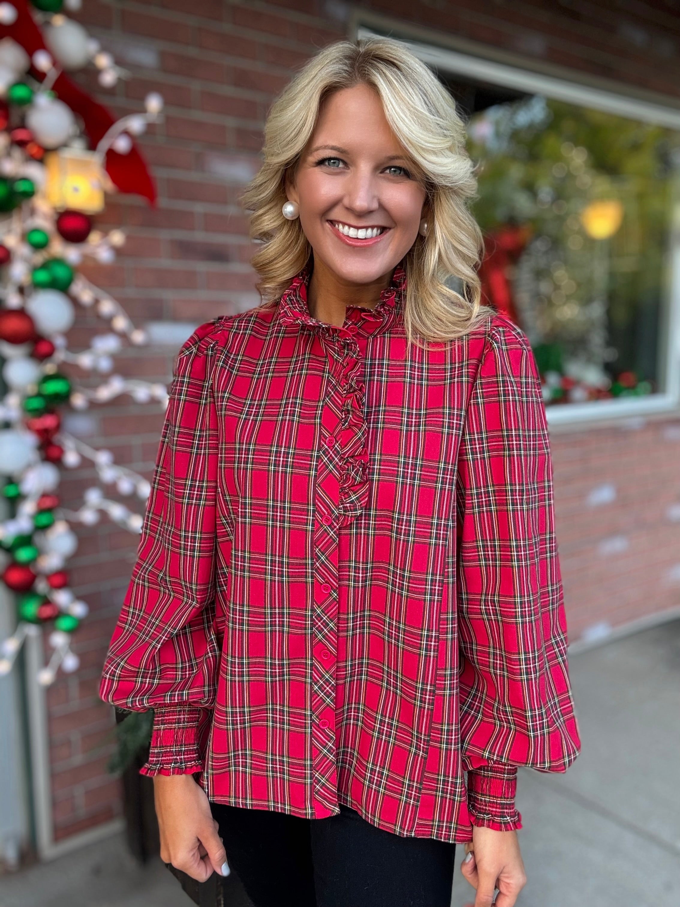 Red Plaid Button Down Top with Ruffle Details