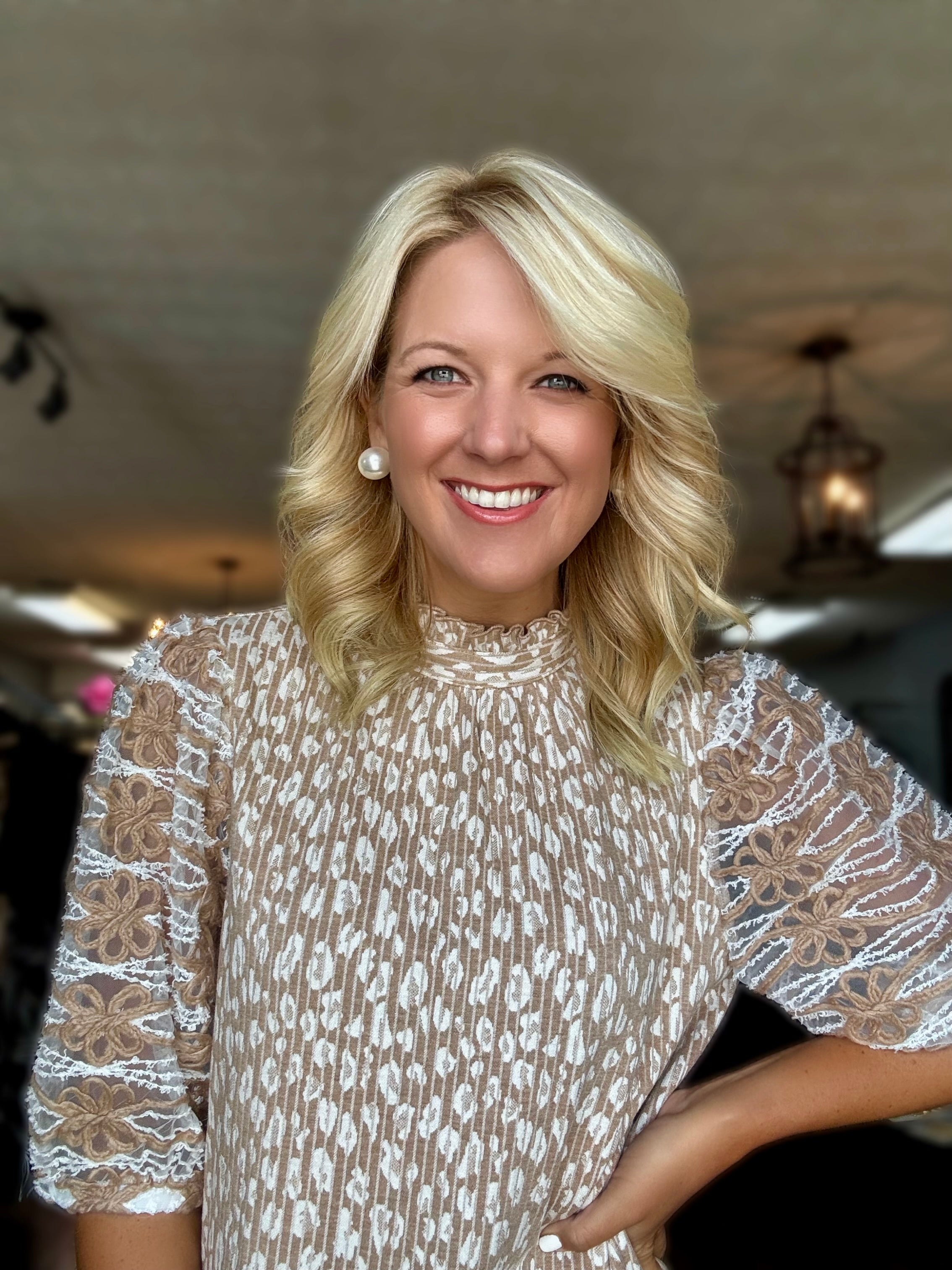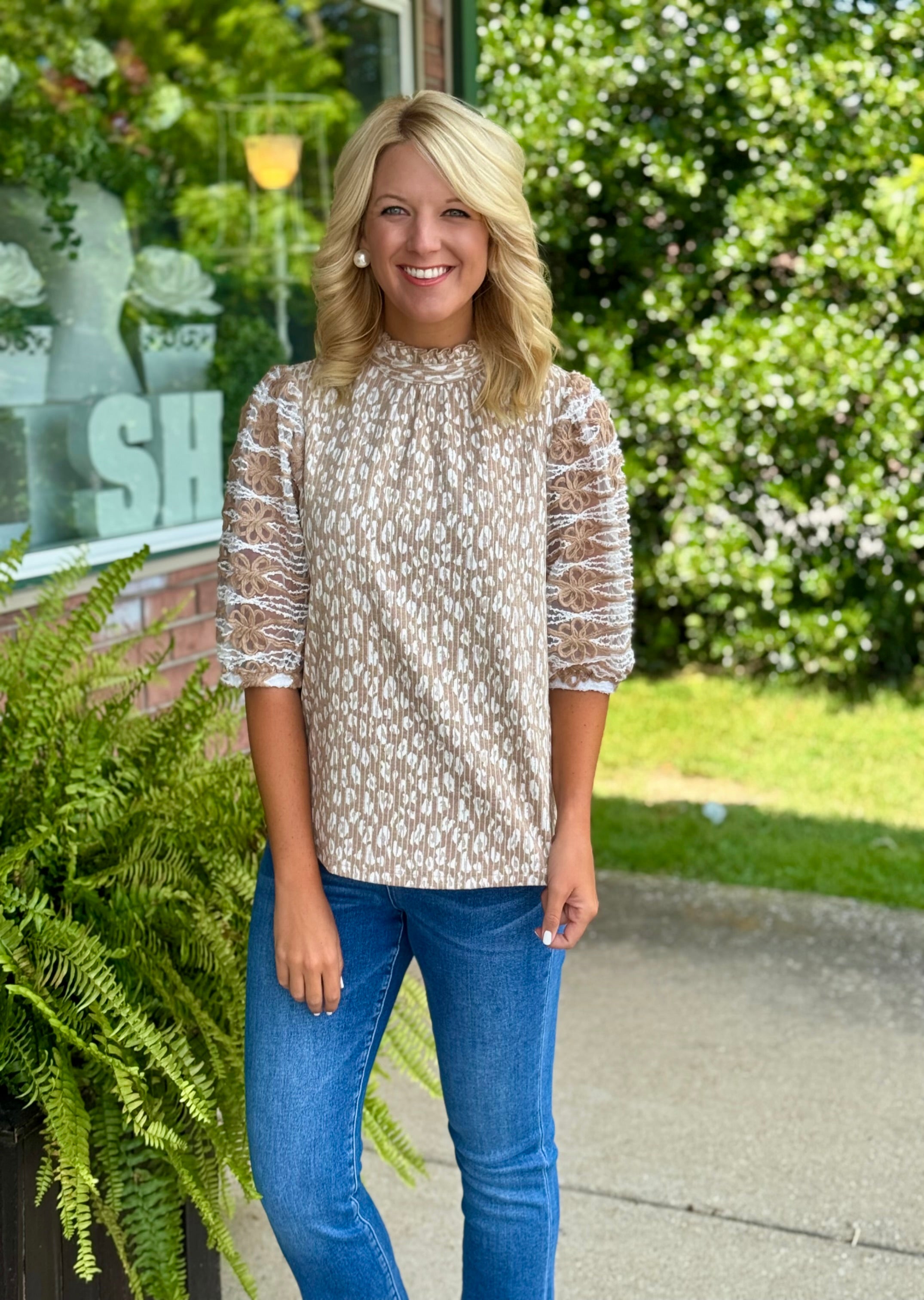 Taupe Cheetah Top with Lace Detail Puff Sleeve
