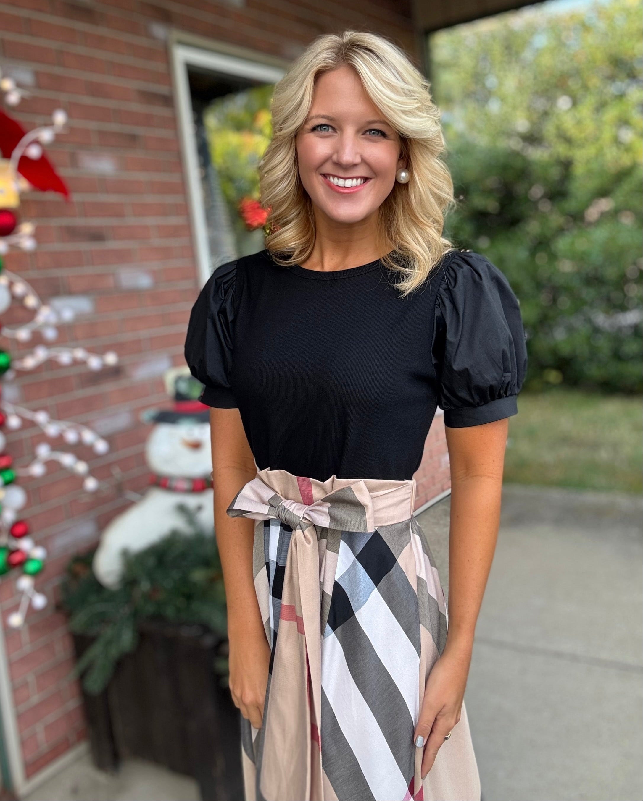 Black Puff Sleeve Plaid Skirt Dress with Bow Tie Detail
