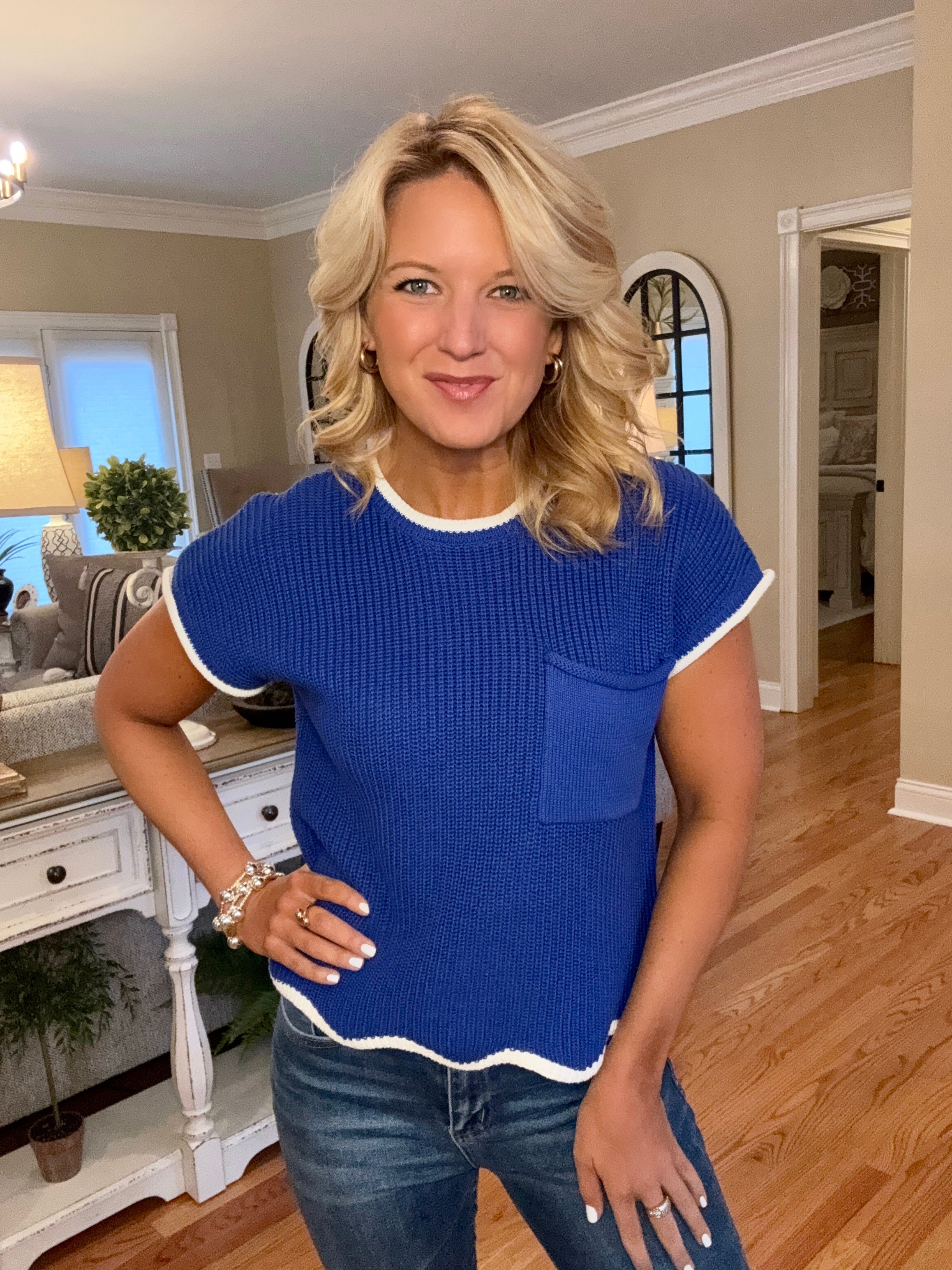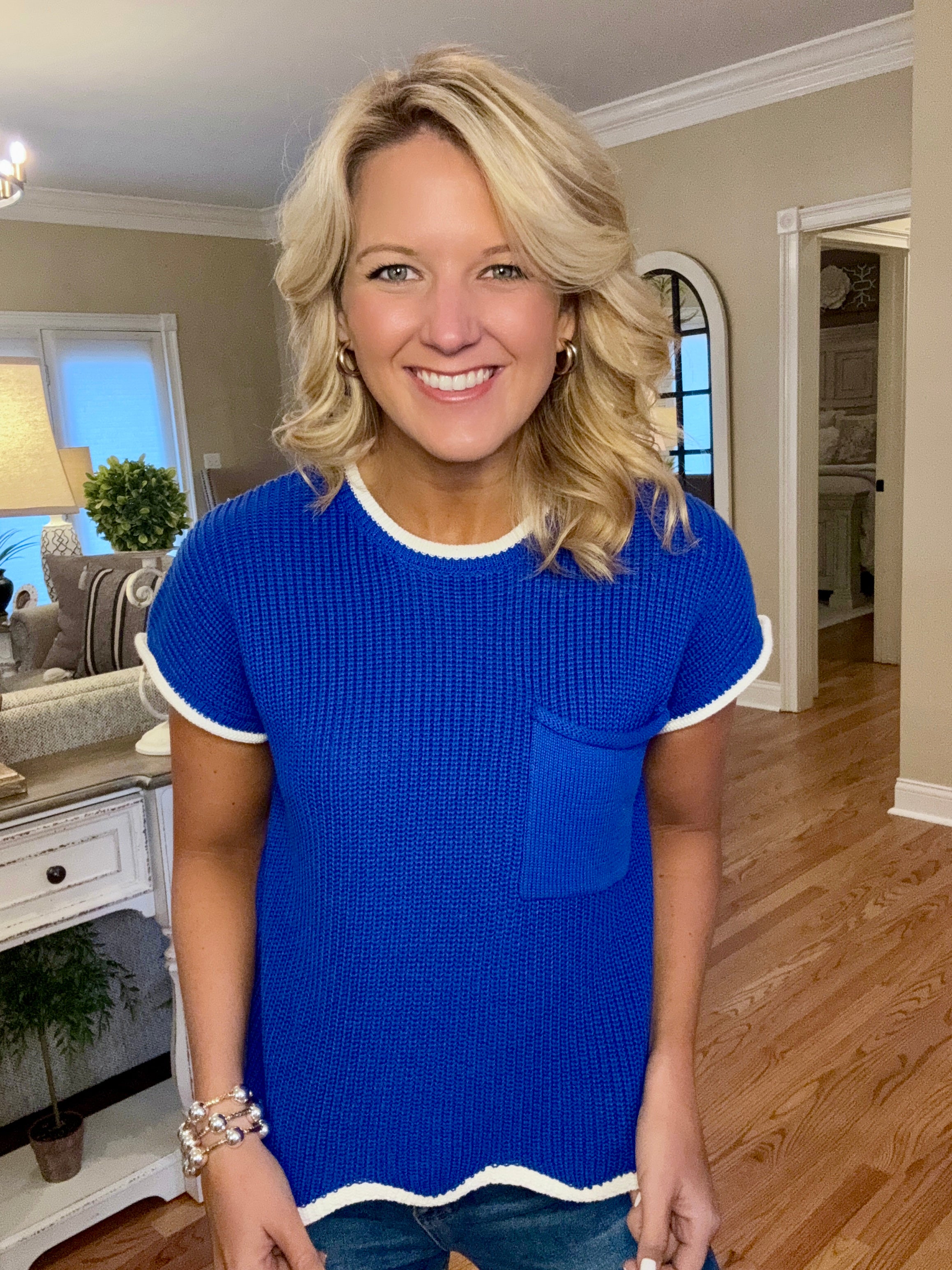 Blue & White Short Sleeve Sweater with Scallop Bottom Detail