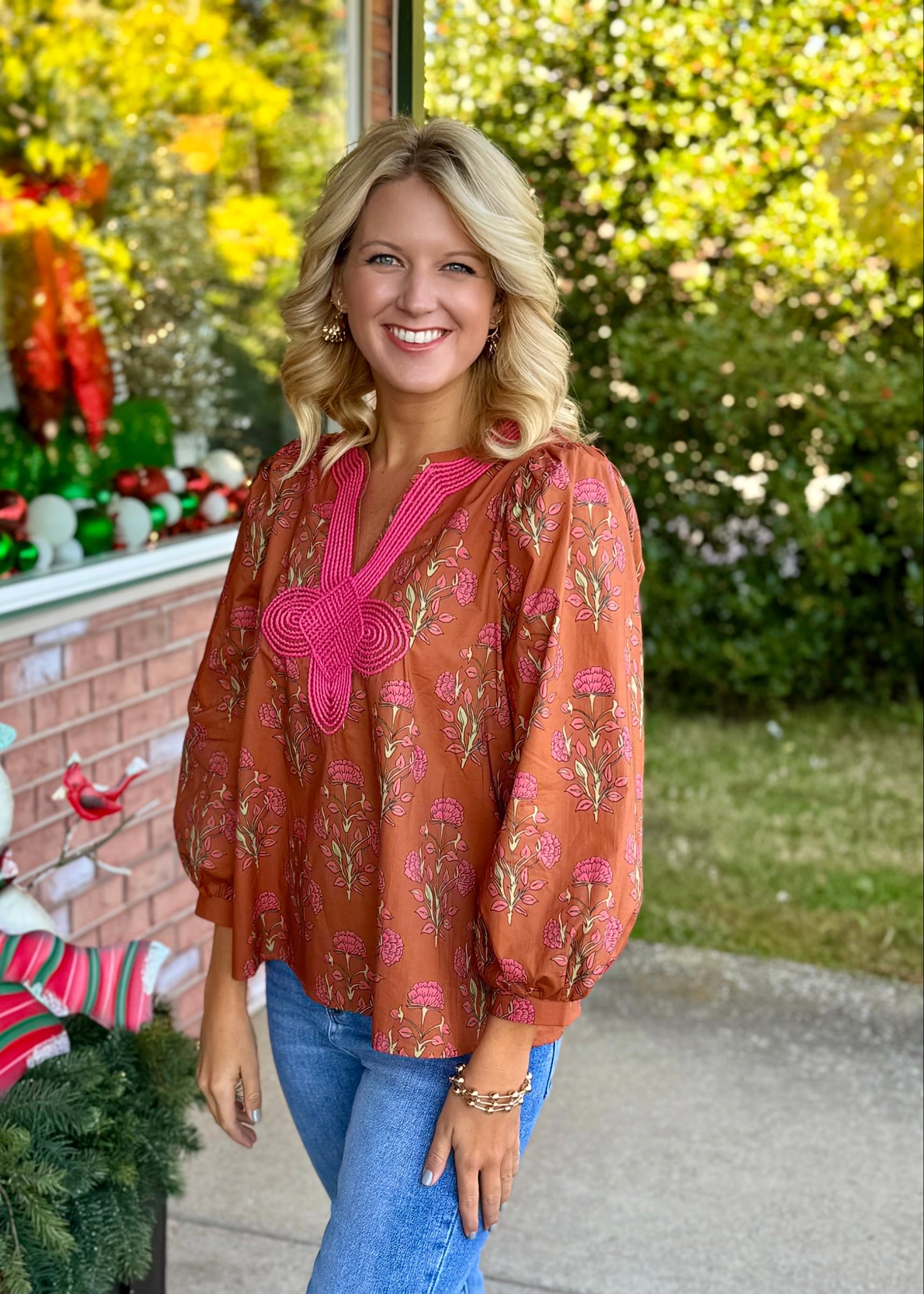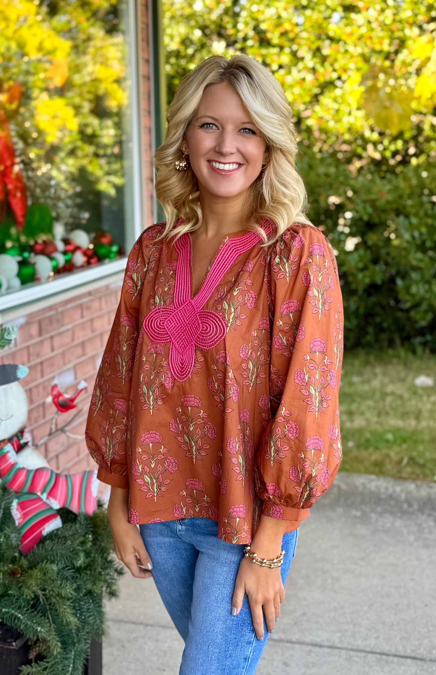 Floral Print Top with Hot Pink Embroidery Detail