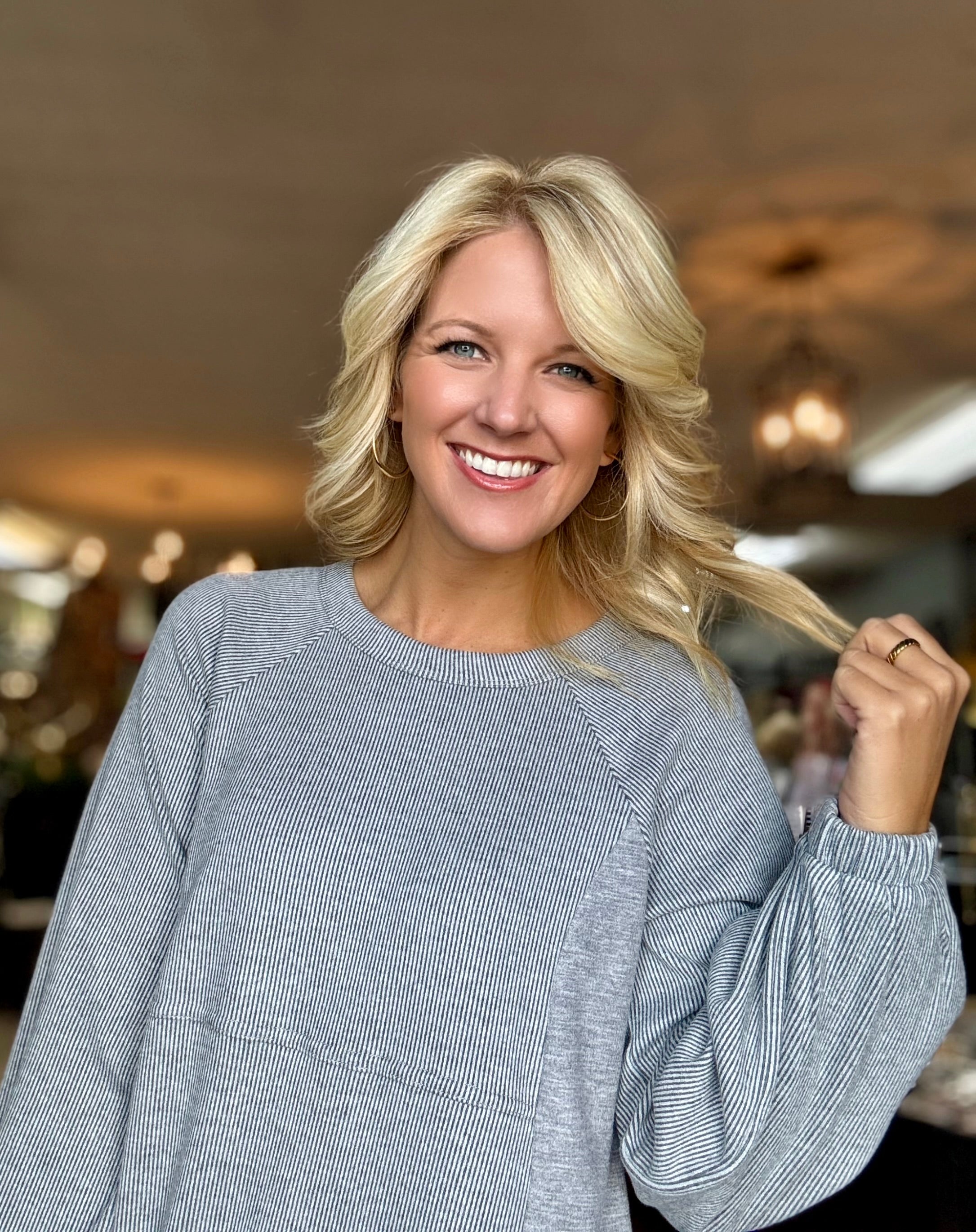 Grey Stripe Pleat Sleeve Tunic Top