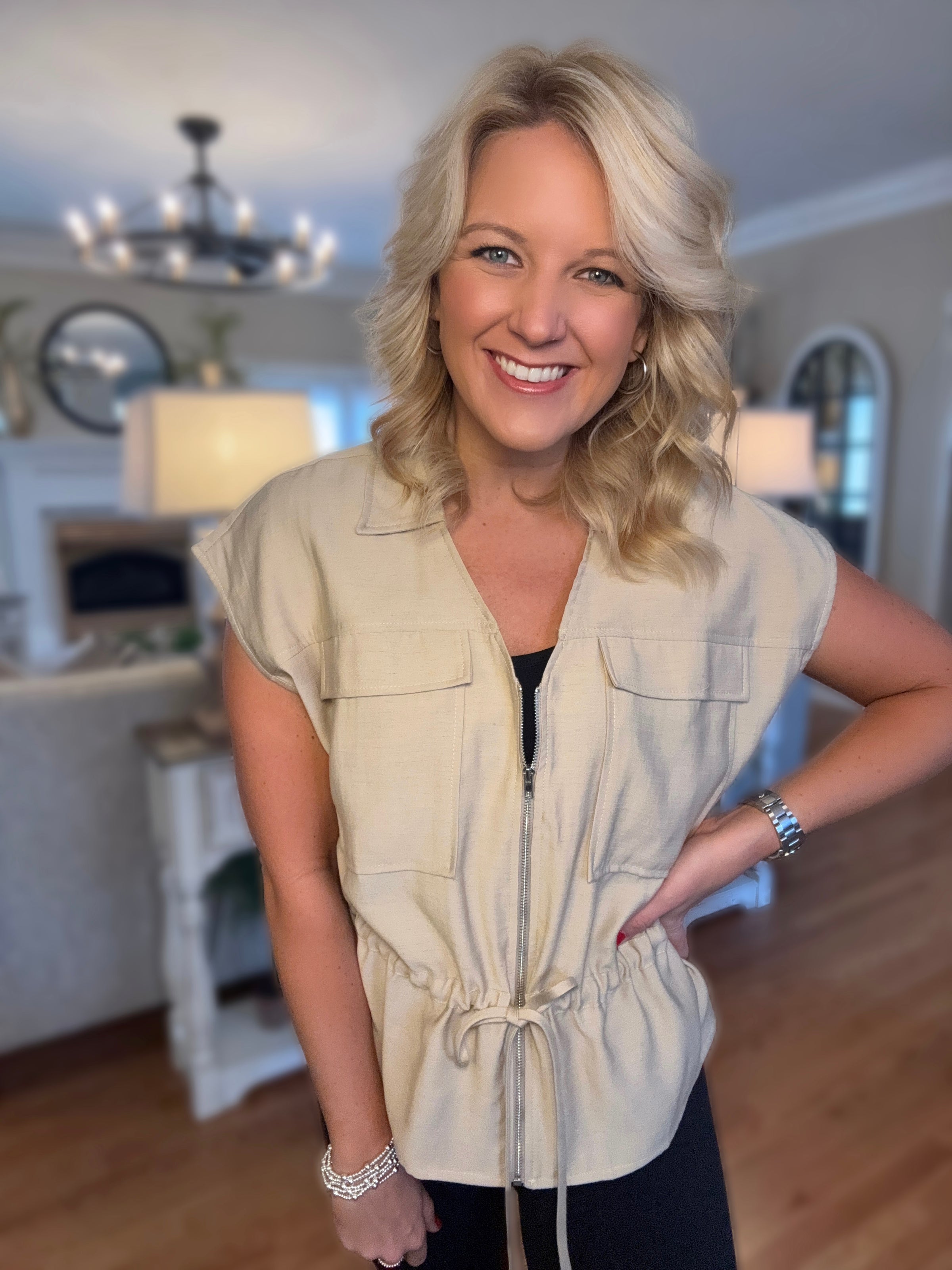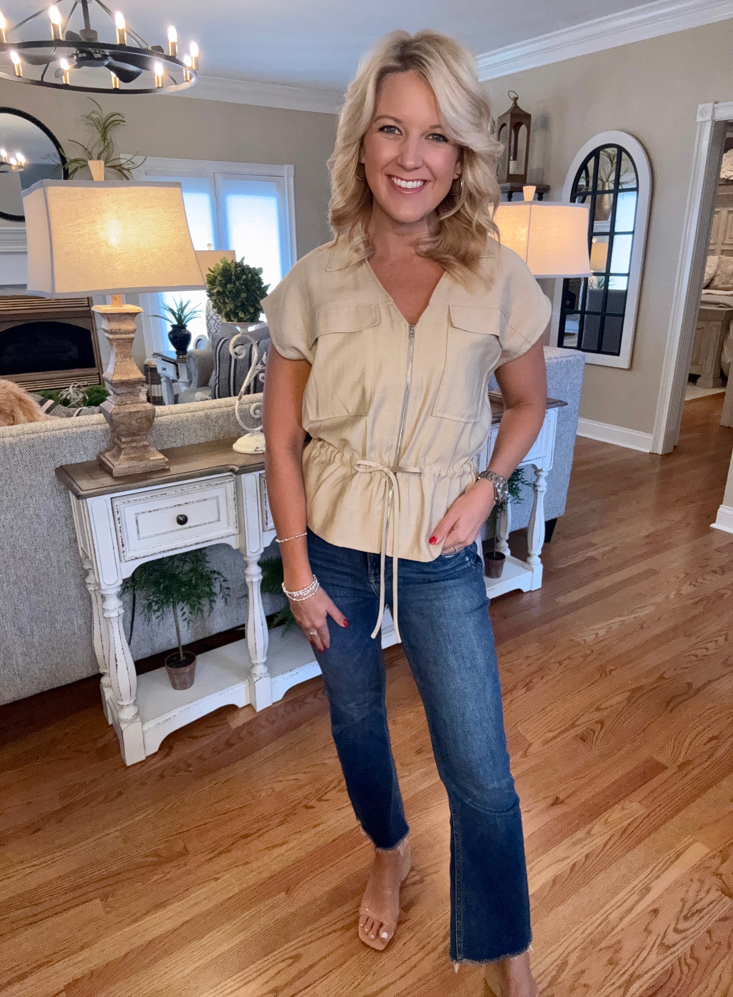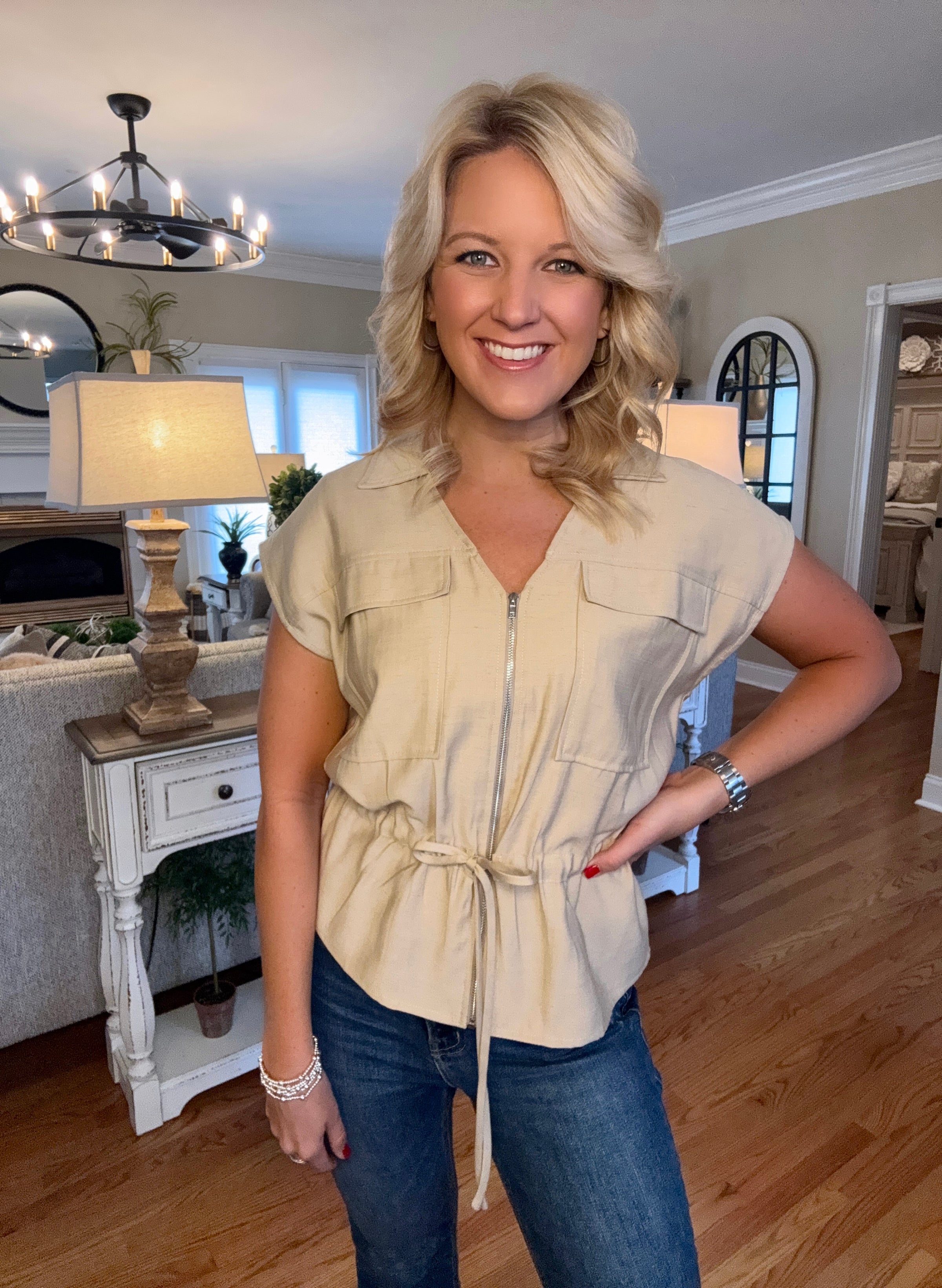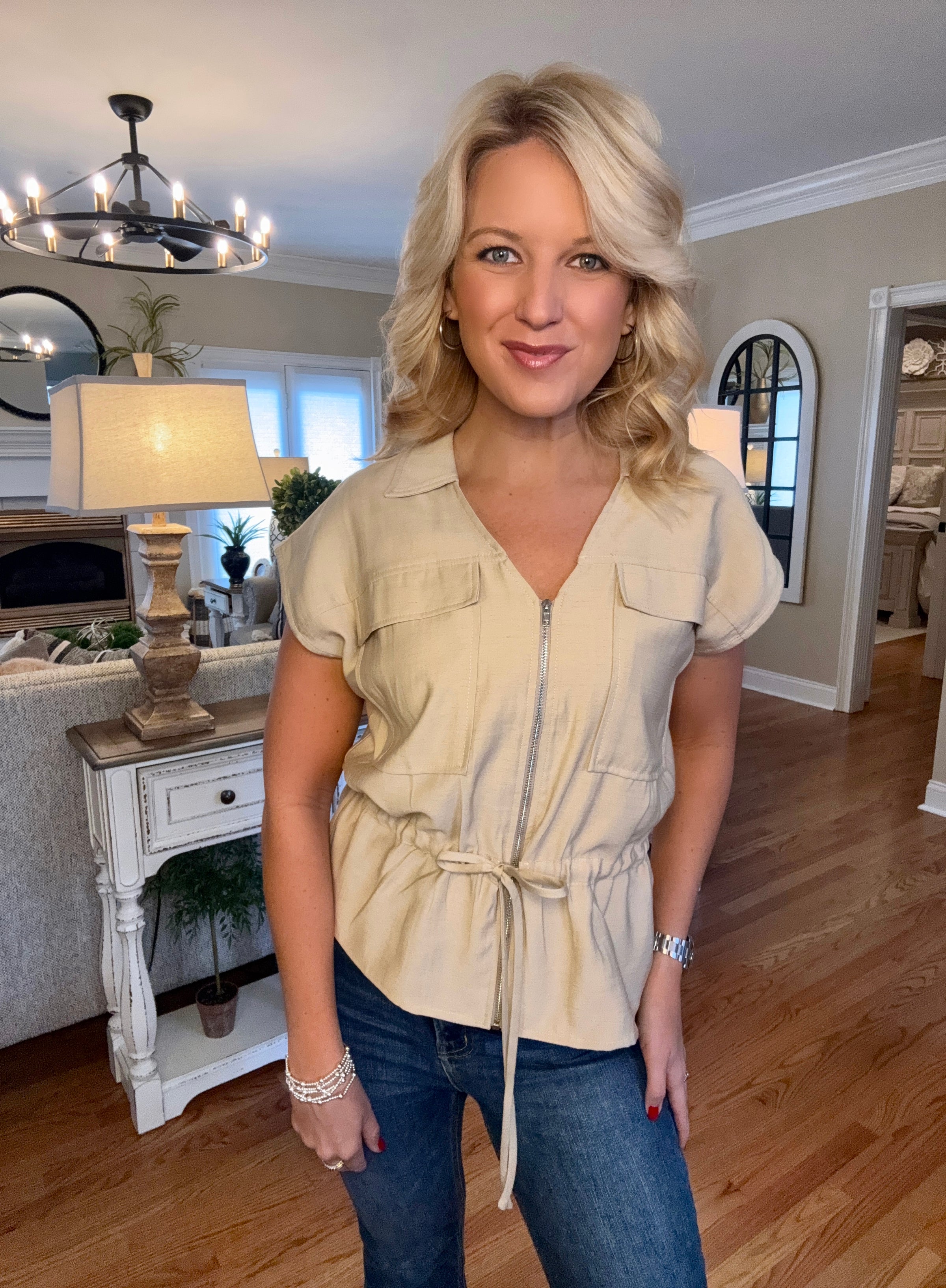 Khaki Short Sleeve Jacket with Cinched Waist Detail