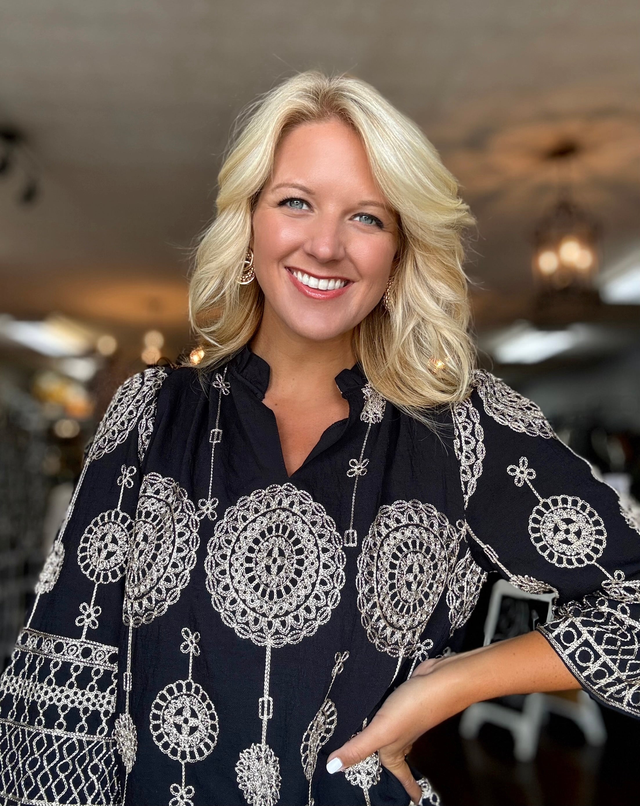 Metallic Embroidered Top with Ruffled Neck