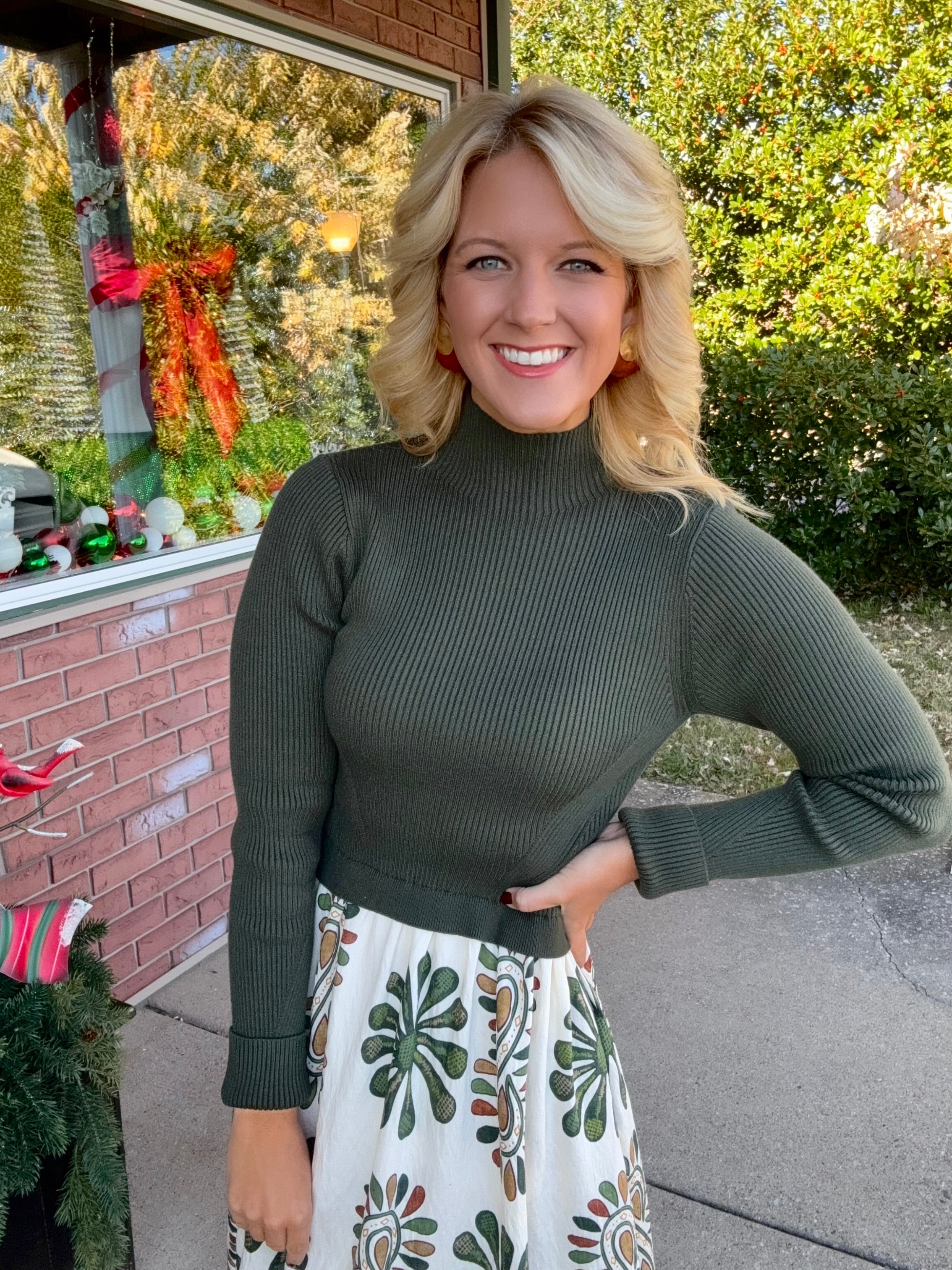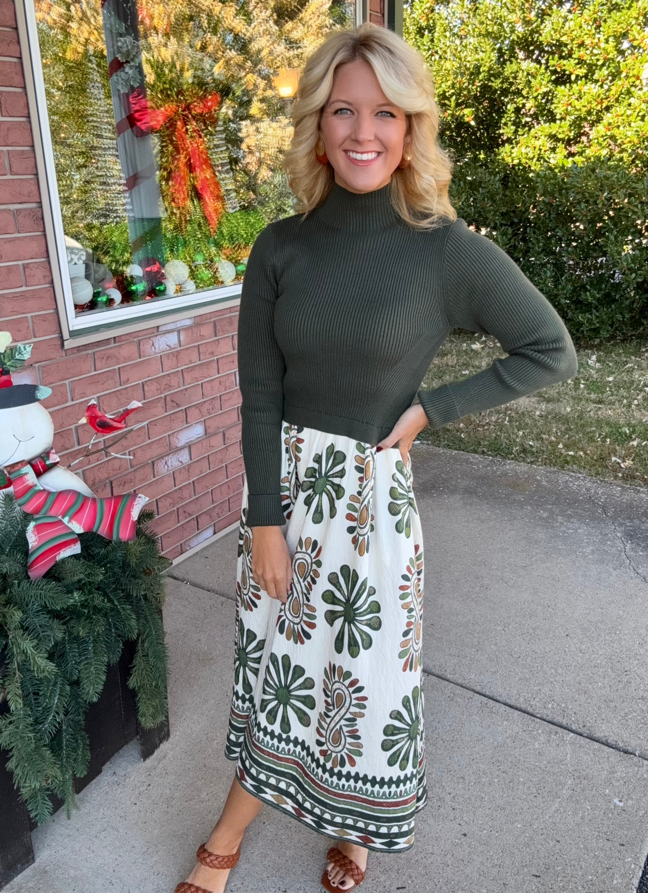 Olive Mix Media Midi Dress with Printed Skirt Detail