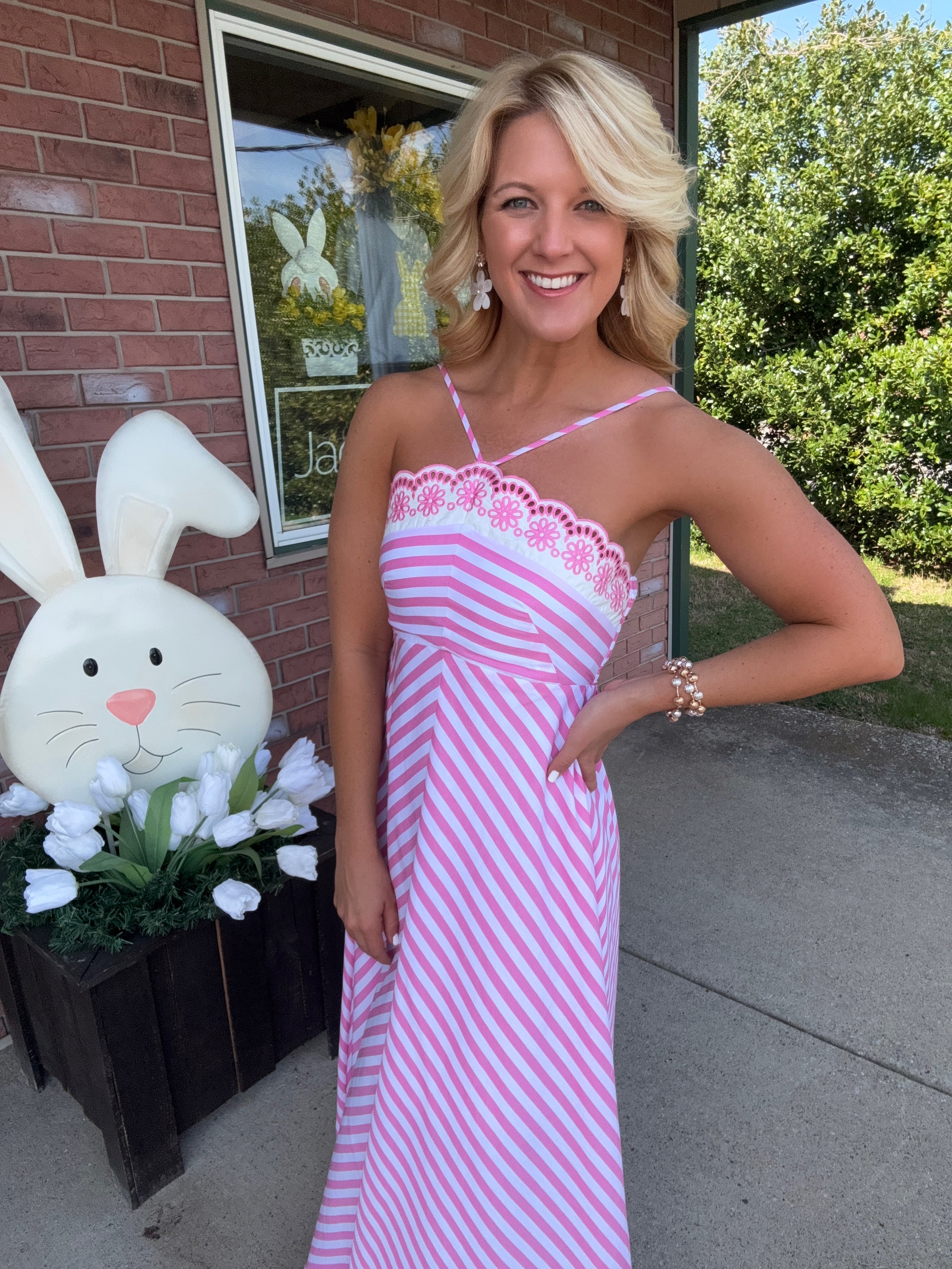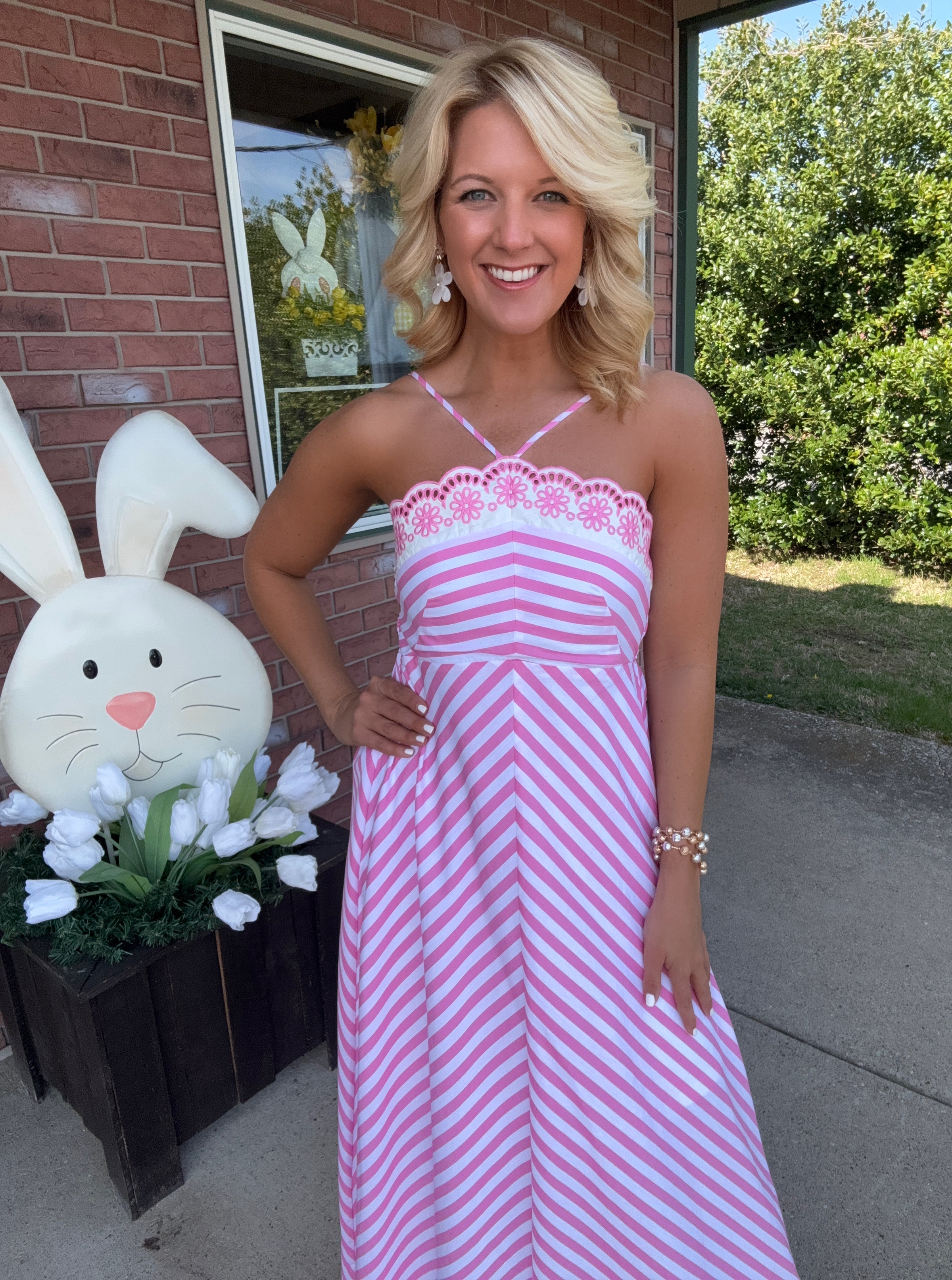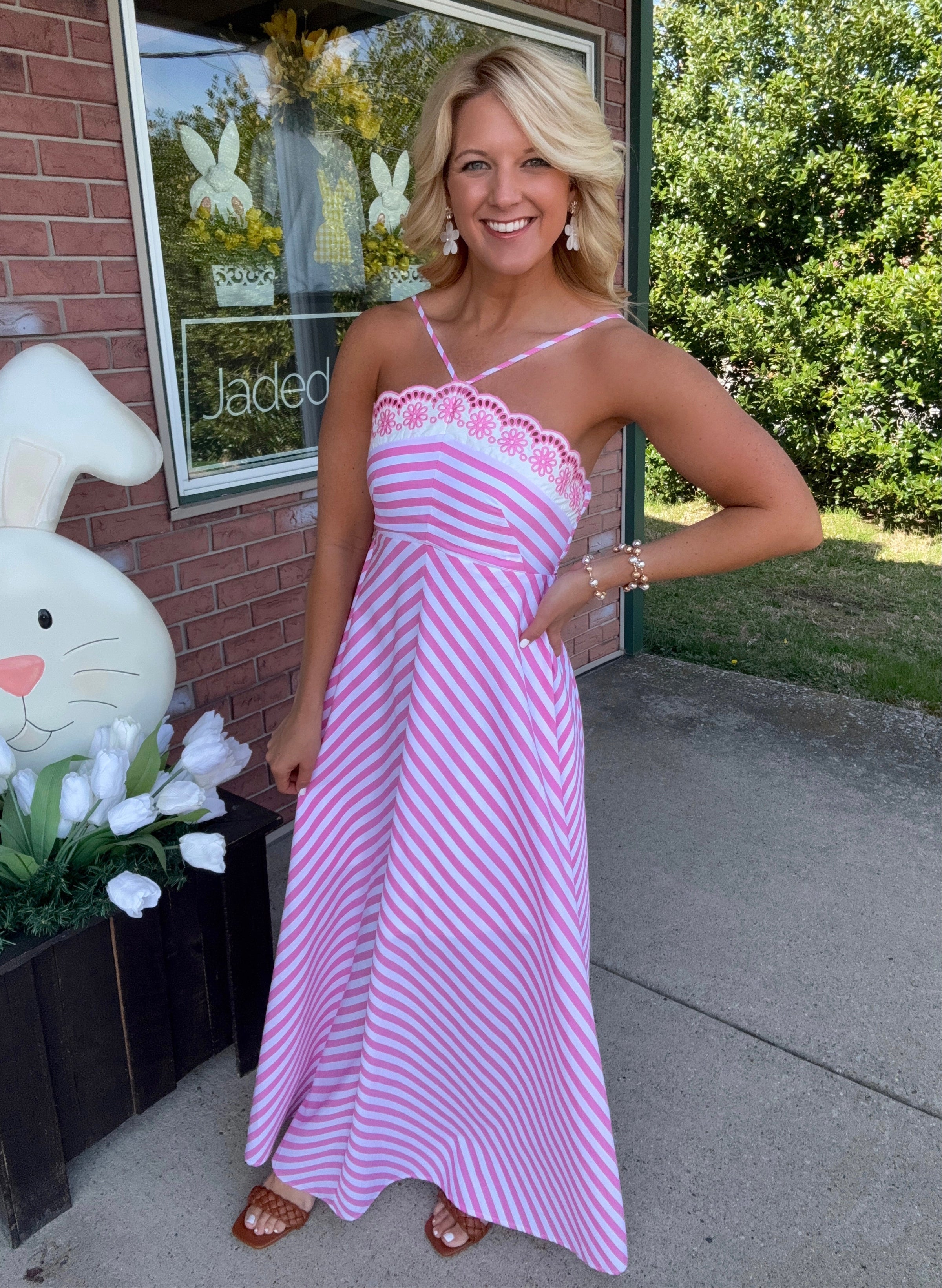 Pink & White Stripe Maxi Dress with Neckline Detail